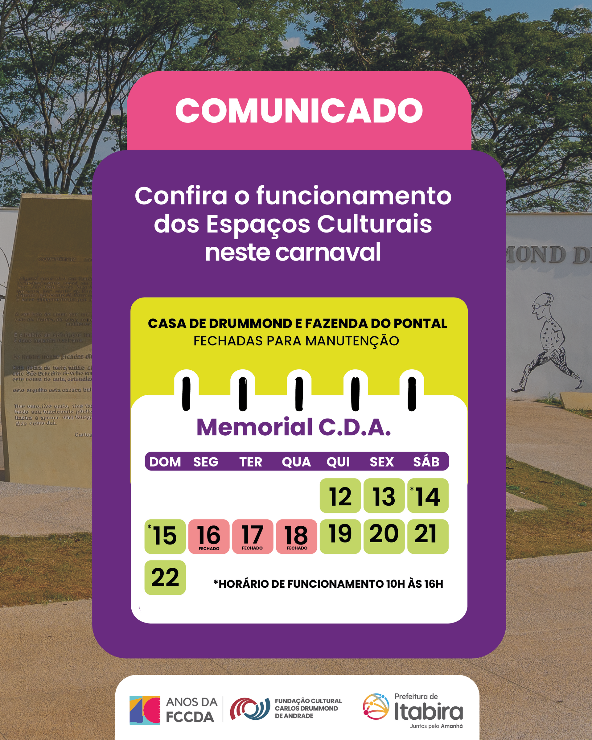 A Fundação Cultural Carlos Drummond de Andrade (FCCDA) informa o funcionamento dos espaços culturais durante o período de Carnaval em Itabira. A Casa de Drummond e a Fazenda do Pontal estarão fechadas para manutenção interna, com o objetivo de garantir melhorias e adequações nos ambientes para receber o público com mais conforto e segurança.