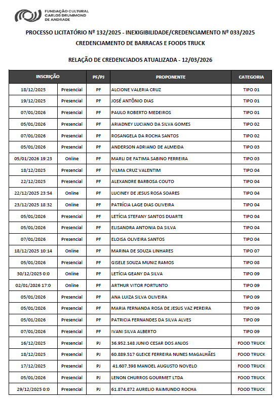A Fundação Cultura Carlos Drummond de Andrade, através da Comissão de Credenciamento, tona publico o resultado da análise das inscrições realizadas até o dia 28/02/2026, conforme critérios estabelecidos pelo edital.
